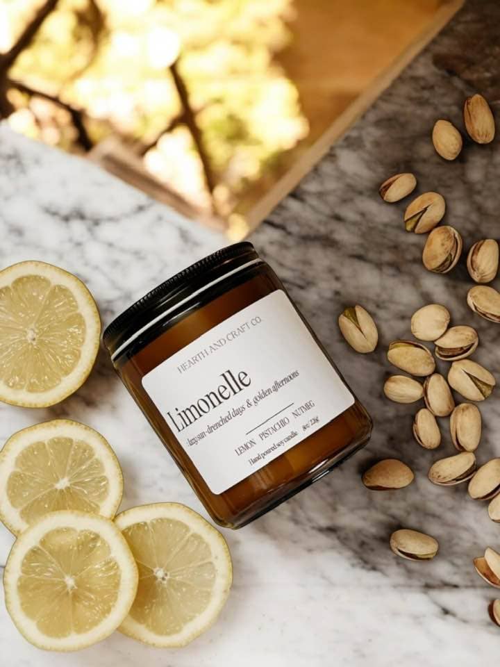 Scent notes of: Lemon, Bergamot, Pistachio, Almond, Nutmeg & Clove | All-natural soy wax, and non-toxic eco-friendly wick, phthalate free fragrances Burn time: 4oz: 20-25+ hours 8oz: 40-55+ hours, 16oz: 60-70+ hours